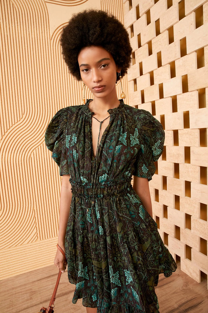 The Ada mini dress is a signature Ulla Johnson silhouette, adorned with a mesmerizing print of birds and botanical motifs. This frock features flecks of lurex thread throughout, as well as a watercolor shadow technique that is highlighted along the hemline. It has short draped sleeves, open neckline, and elastic waistband that is finished with a side seam zipper.