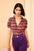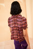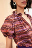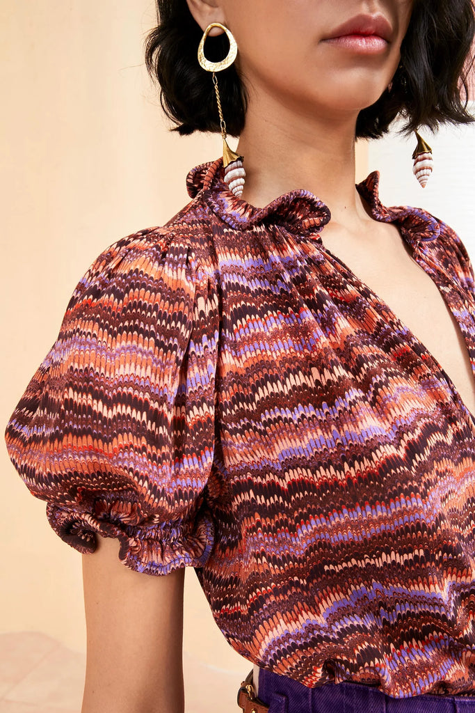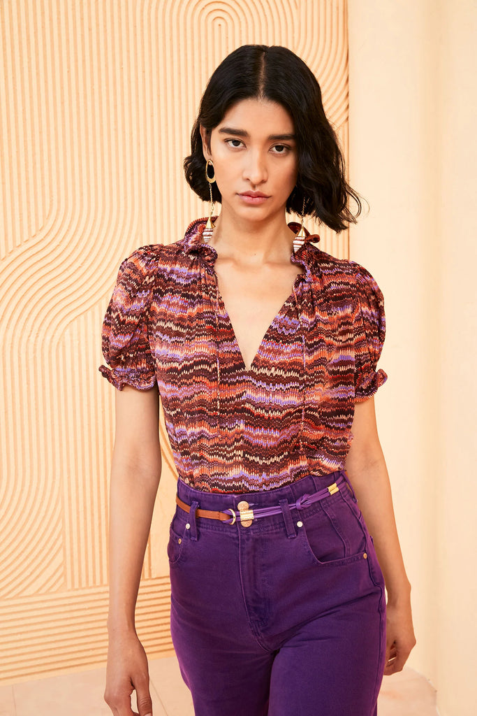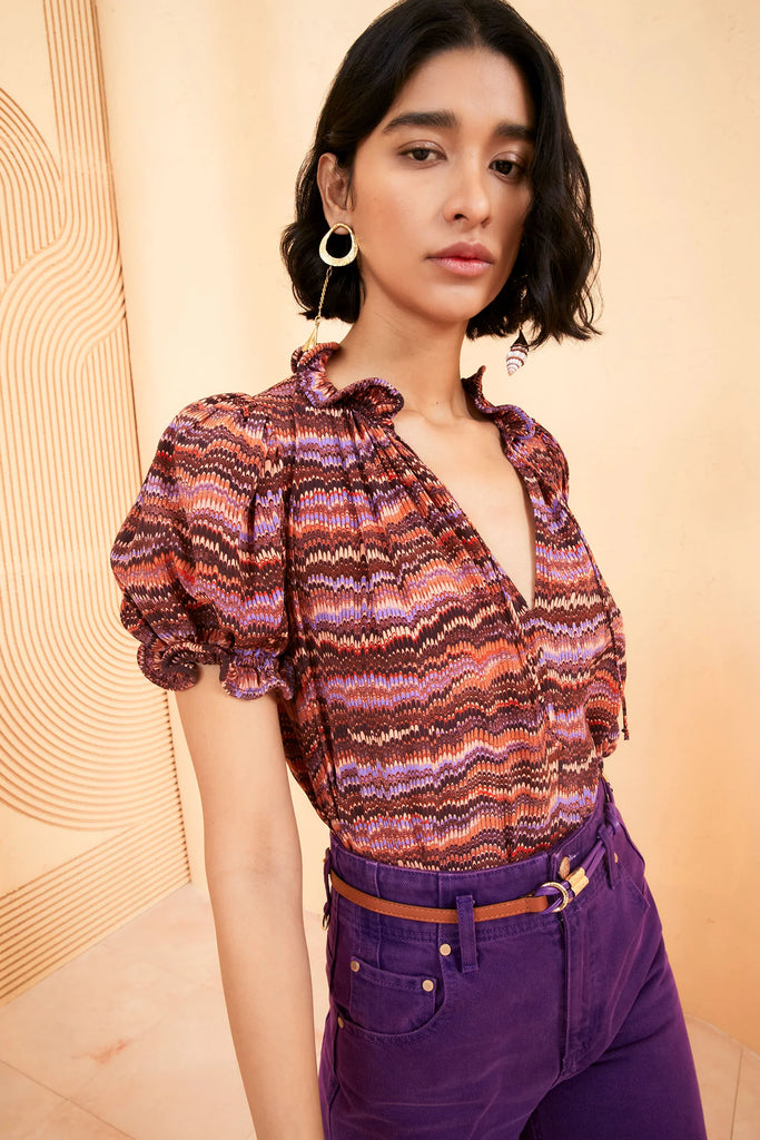 The Corine Top is cut from soft silk crepe de chine, printed in a variegated pattern of purple and red. This sweet blouse is designed with an airy bodice, short puff sleeves and undulating ruffles along the neckline and sleeve cuffs. It is finished with a grosgrain tie at the collar.