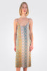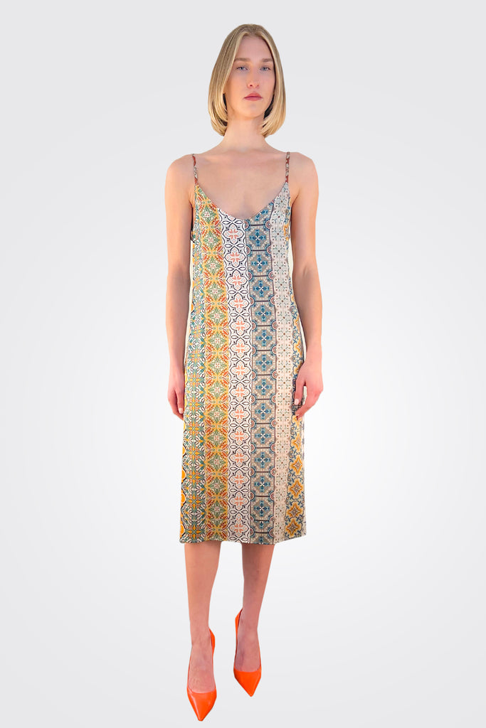 Printed silk Unbreakable Evolution dress with spaghetti straps. The dress features tile print on this slim fit silhouette. Round v neckline, and side slit.