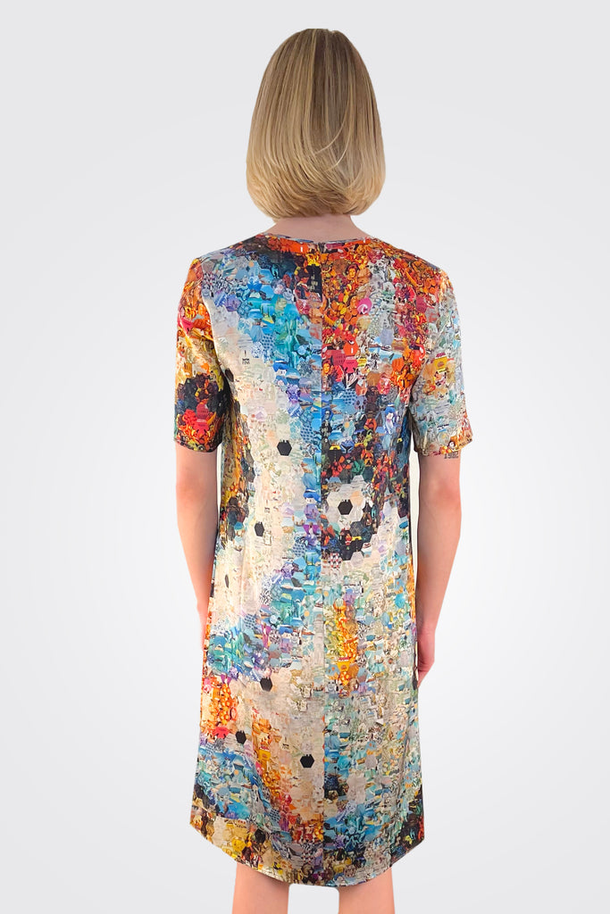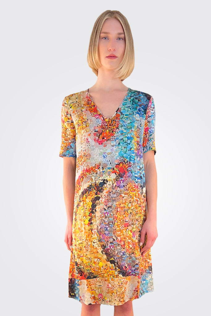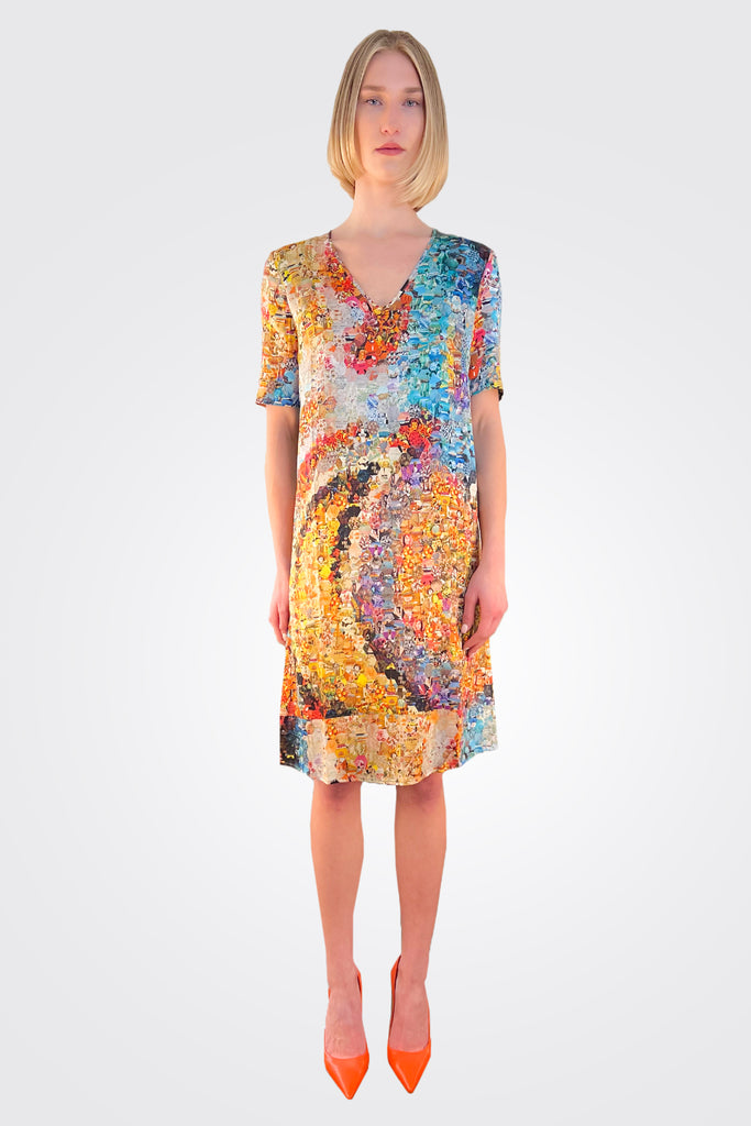 Printed silk Unbreakable Evolution dress with short sleeves. The dress features beautiful print on this short slim silhouette. V neck and short sleeves
