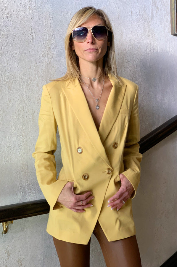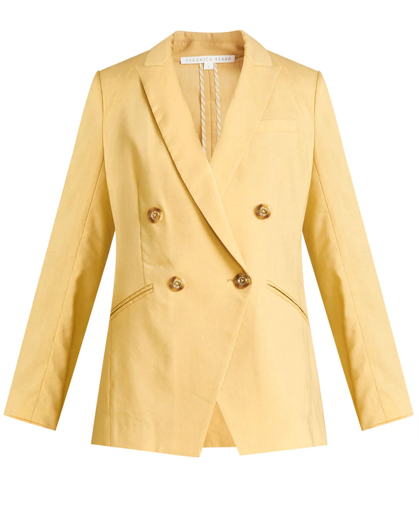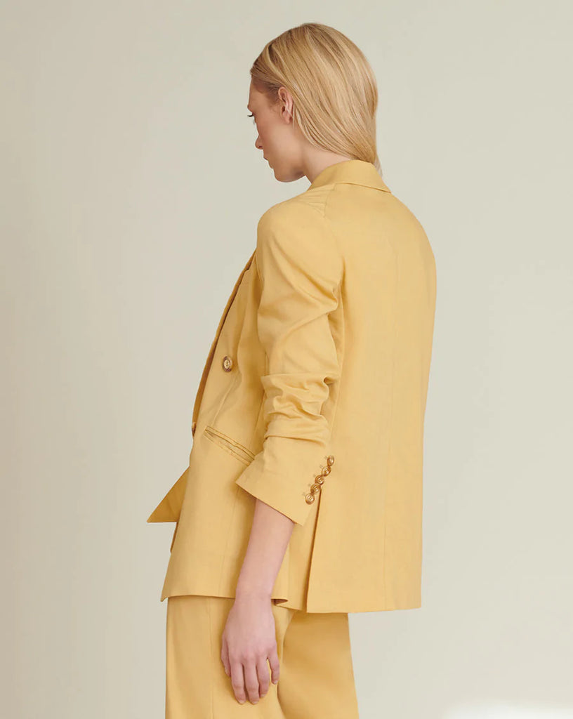 Nisha jacket features a relaxed linen-blend with slight stretch for a flexible fit. A long length and oversized look add to its casual appeal. Decorative buttons and a double-breasted design keep this style polished and refined.