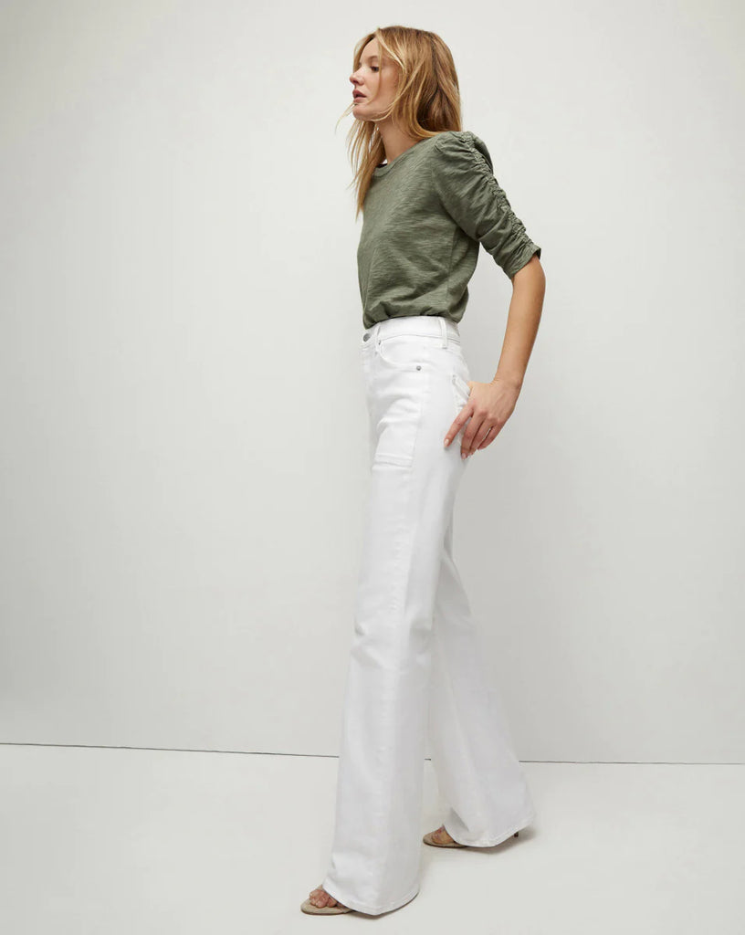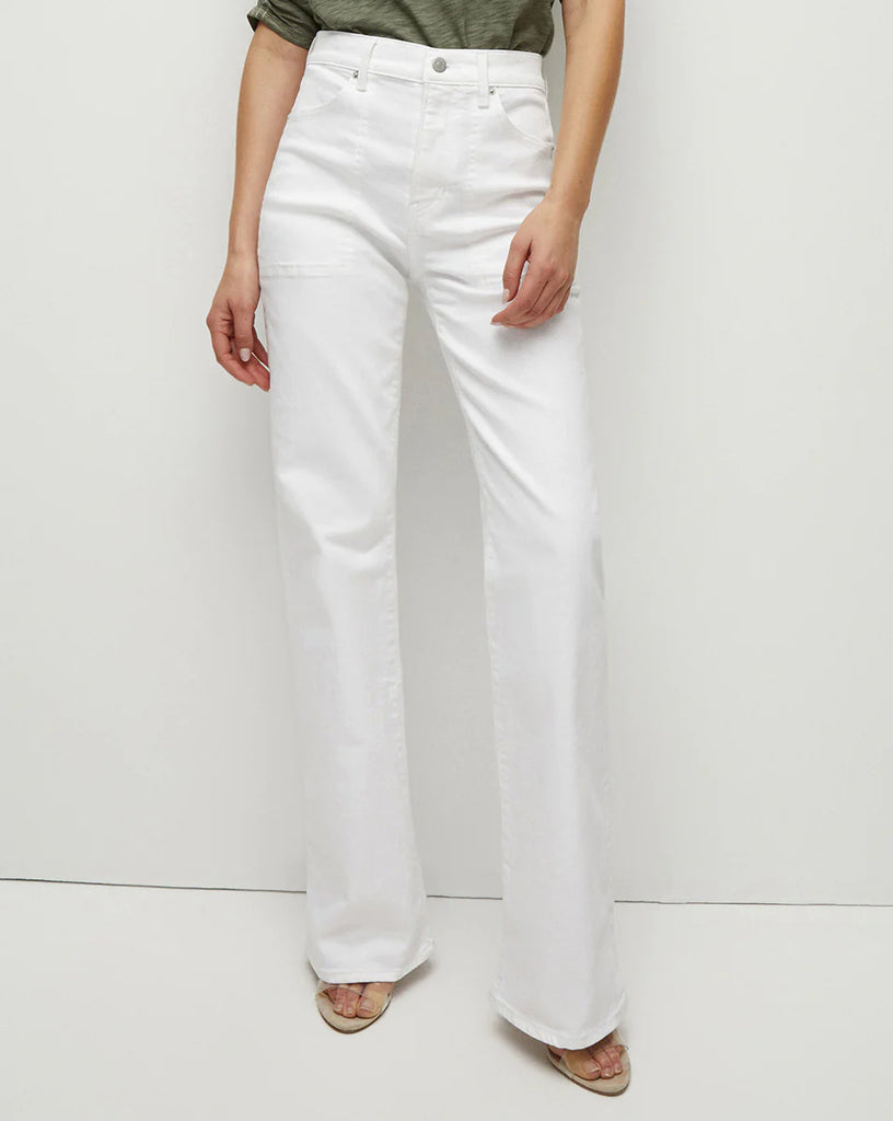 Updated in clean white, the elongating Crosbie jeans feature a flattering high-rise, patch pockets and wide-leg silhouette that is forever chic. We love pairing this sophisticated pair with a simple top and platform heels.