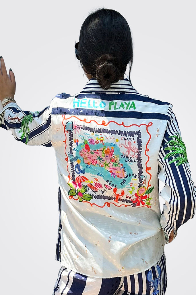 Shirt with blue vertical stripes and colorful lobsters. Exclusive Vilagallo fabric made in Spain.
