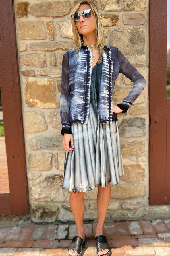 At 25 South Boutiques, we’ve gathered Uchitel’s most compelling pieces—think flowing hand-dyed silk dresses in sea-toned ombrés, plush cashmere sweaters layered with gradient hues, and hand-pleated skirts that move like verses in motion. Each garment is unique, echoing the spirit of craft and the whisper of artistry.