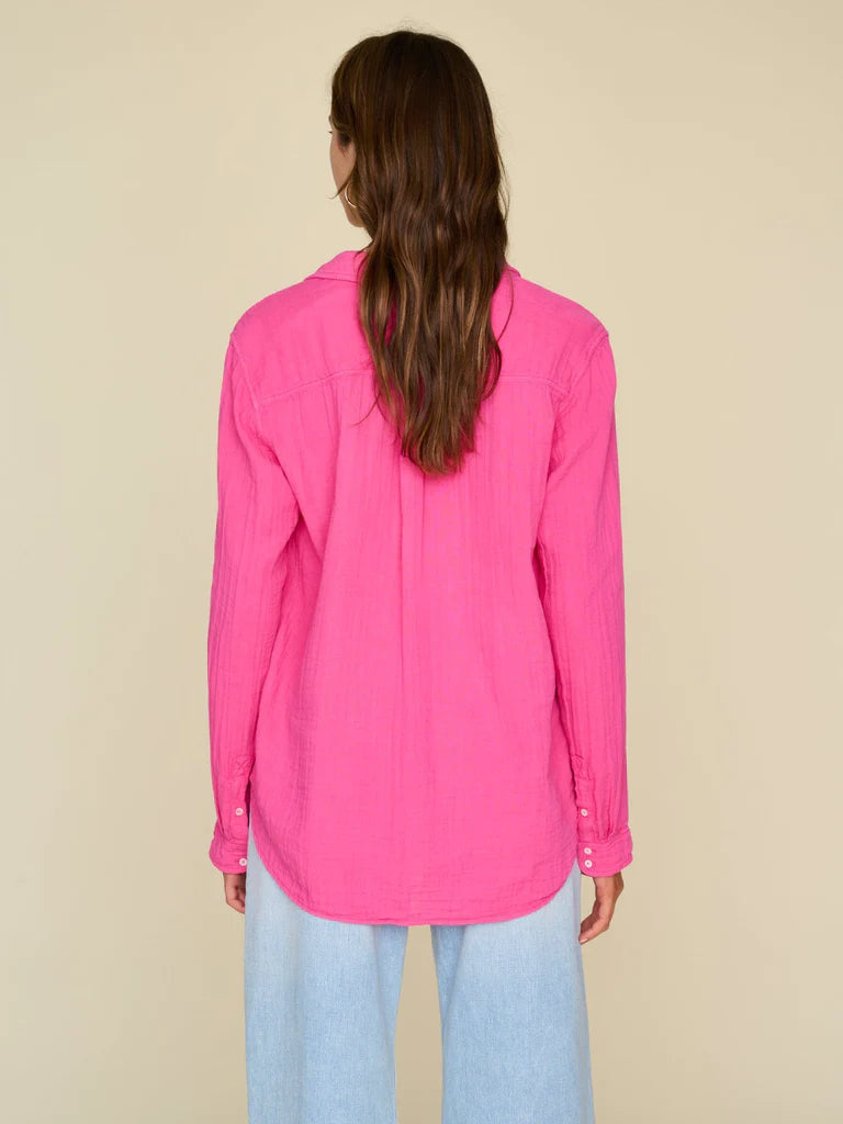 Bare Necessities. Scout is made in washed double faced cotton gauze for a soft, gently crinkled feel. This lightweight button-front shirt has a shirttail hem and box pleat at back yoke.