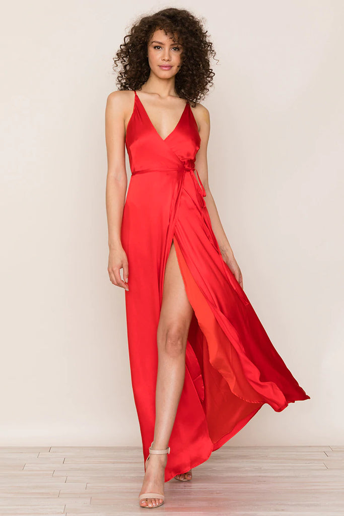 flowing Rush Hour Silk Maxi dress is your new go-to from weddings to running around the city. Details include a crossover bodice with deep v-neckline, snap chest closure, self-tie waist, and cross-back adjustable spaghetti straps.