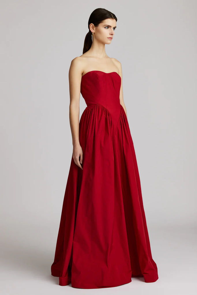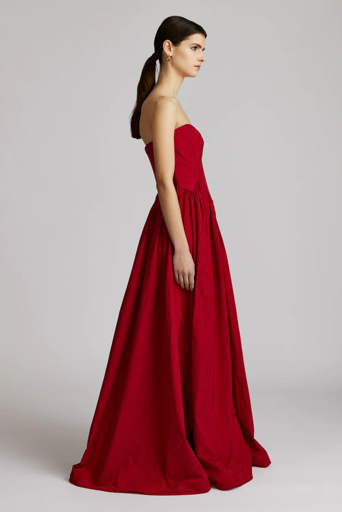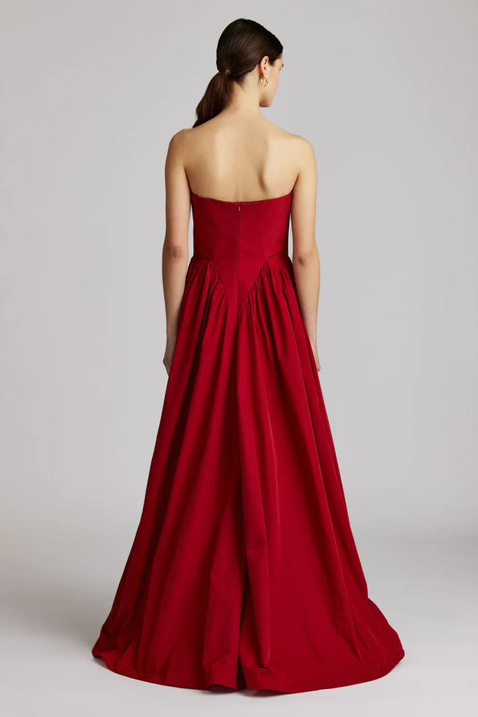 Cast in a crimson red with a soft sheen, the Sweetheart Taffeta Gown offers refined sophistication in a timeless silhouette. The fitted bodice is designed stitch detailing at the waist and balanced with a full, floor-length skirt. The conveniently-hidden side pockets are a favorite feature.