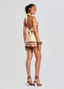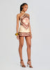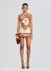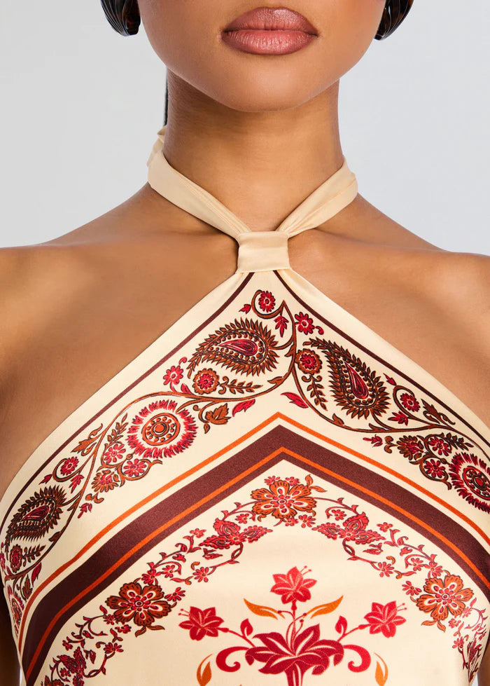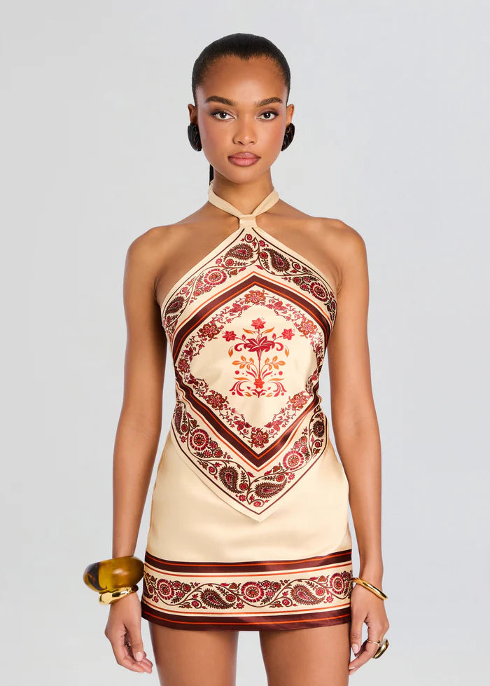 Introducing our Adelaide Dress, featuring a captivating halter neck and alluring open back design. Embrace the essence of paradise with this stunning piece that seamlessly combines elegance and allure. Crafted with silk fabric and adorned with a vibrant tropical print, this mini dress evokes the spirit of summer in every detail. The halter neck adds a touch of sophistication, while the open back design exudes effortless charm, making this dress perfect for sun-soaked days and balmy nights. Shown here in Terracotta Bandana.