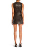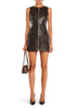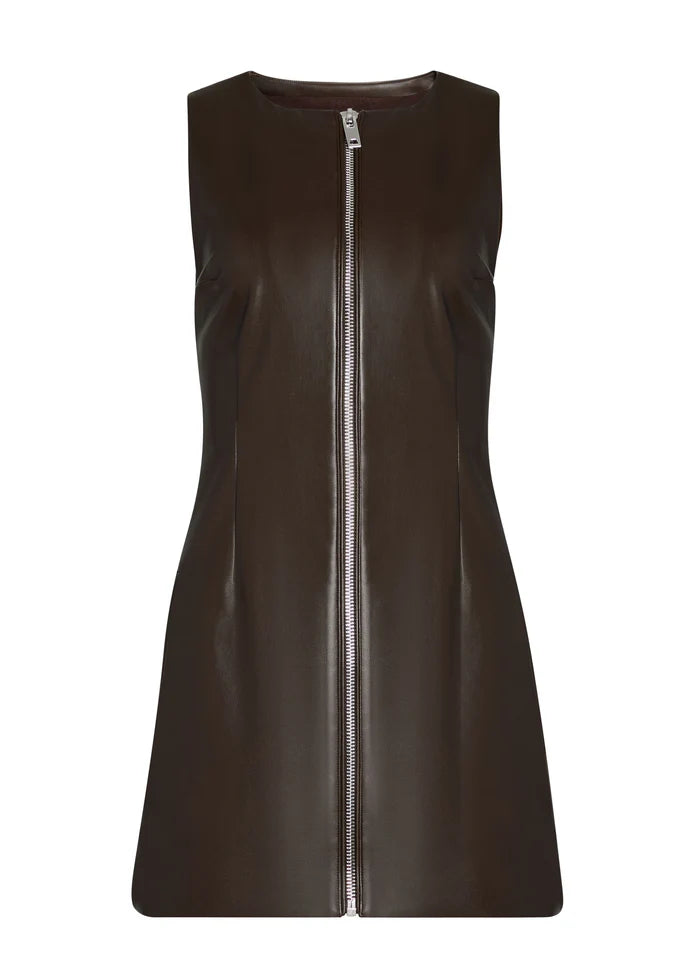 Vegan leather mini dress with a functional silver metal front zipper. Shown here in Ash Brown.