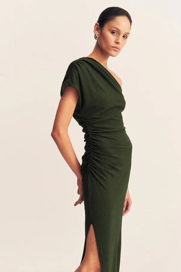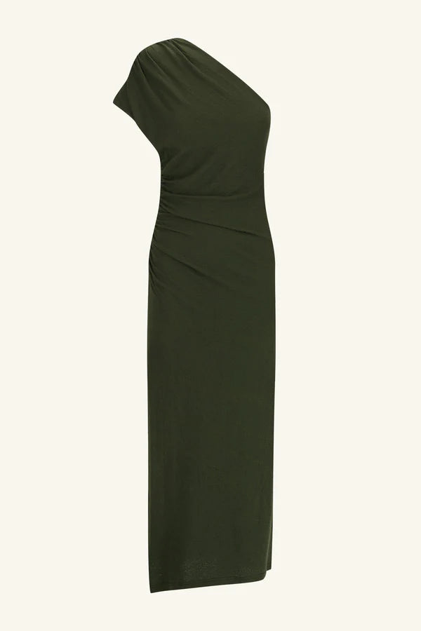 Asymmetrical one shoulder midi dress in army green in a soft cotton jacquard.
