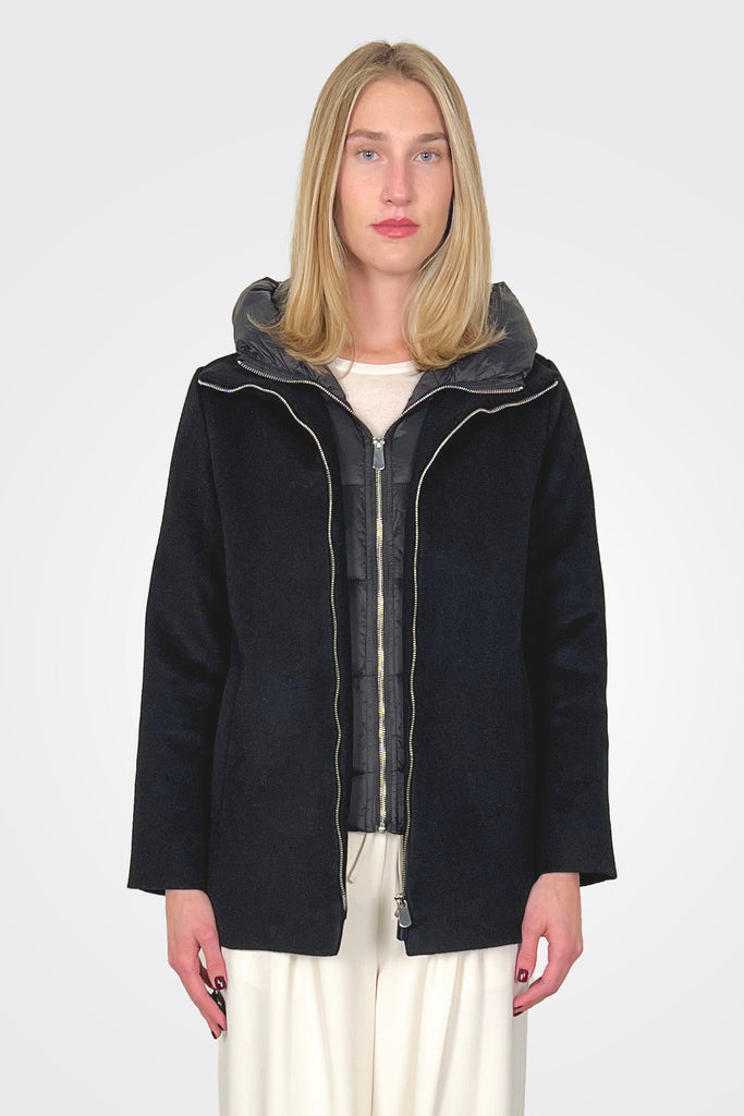 Short crushed broadcloth jacket with double zipper and interior with removable nylon hood.