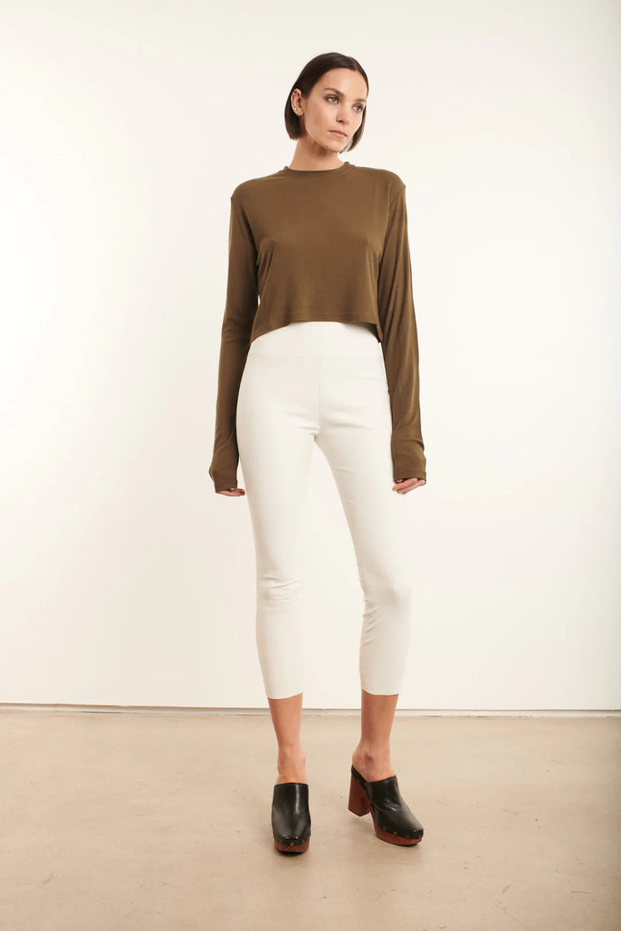 timeless capri leggings in white will quickly become an essential, and fun, part of your wardrobe. Fitted with a high-rise elastic waistband, they adapt easily to any body type and cut at a mid-calf capri length. These pants can be casual or dressed up and pair well with stilettos or sneakers, a blouse or a tank top. This style is a great option for petite figures!