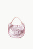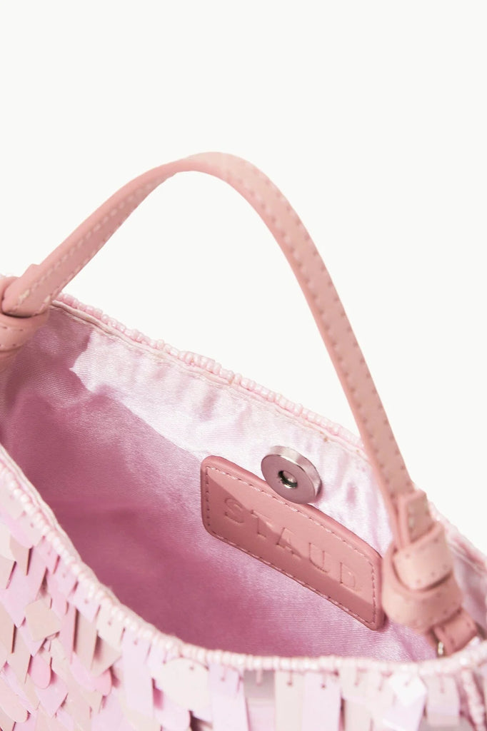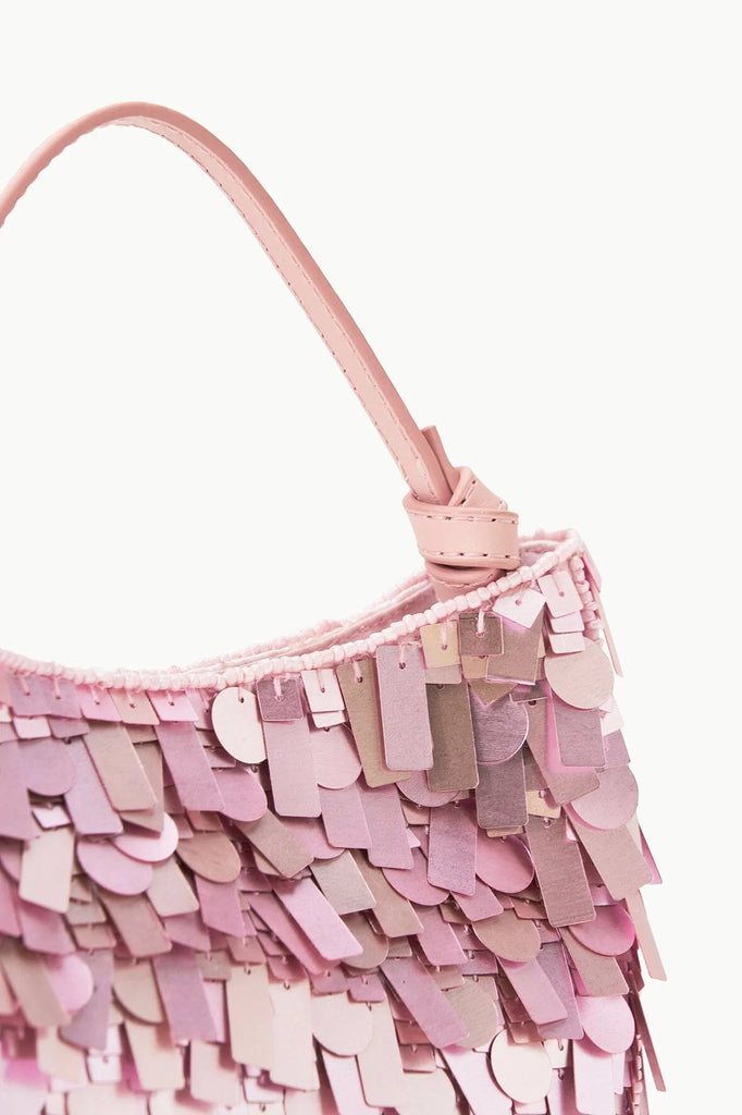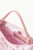 The Crescent Mini Bag is a new evening bag silhouette from our Holiday collection. A mini bag with a knotted leather top handle, the bag is adorned with shiny paillettes to perfectly pair back to any cocktail dress.