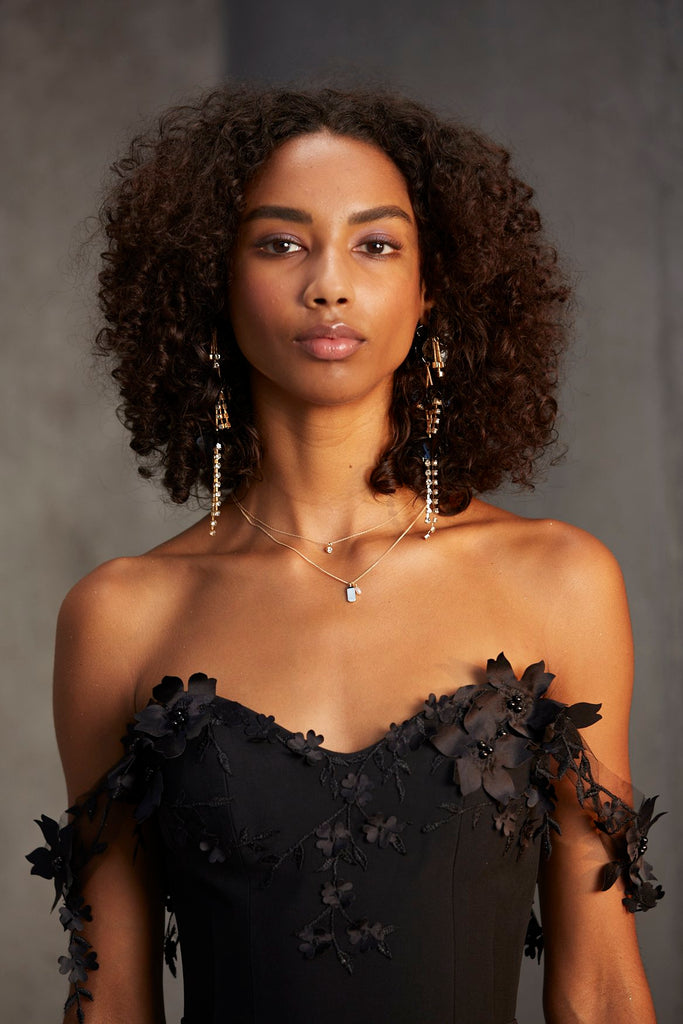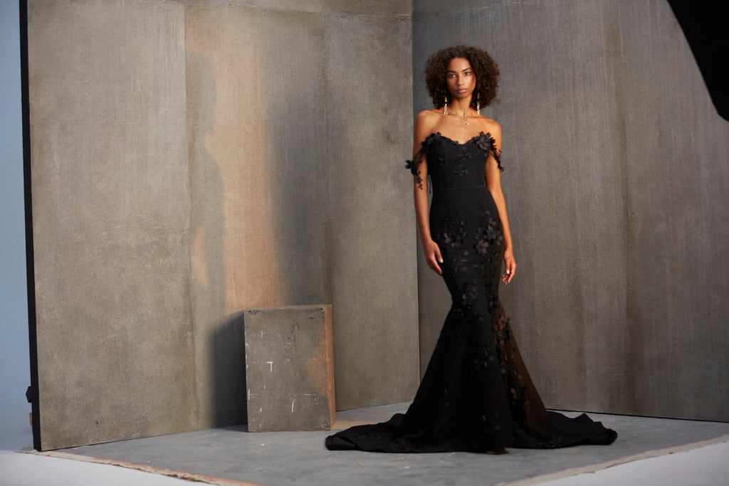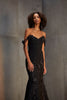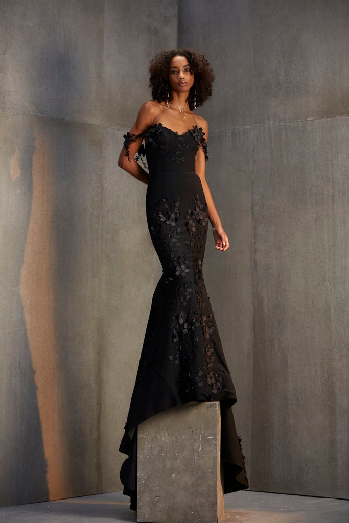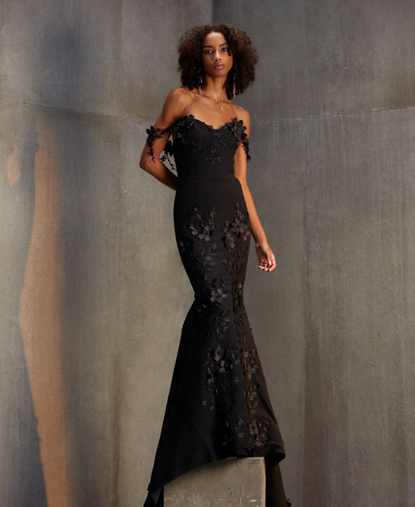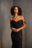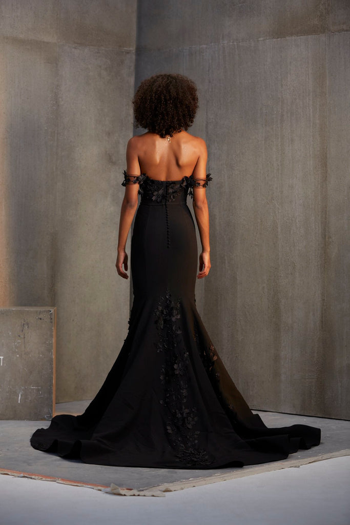 This Floral Appliqué Gown features a fitted bodice, a fitted trumpet style silhouette, and a sweetheart neckline. Off shoulder straps and black floral appliqué brings a chic, timeless elegance to any occasion. Perfect for showcasing delicate curves and creating an unforgettable look.
