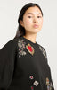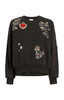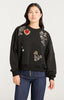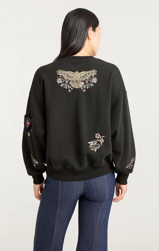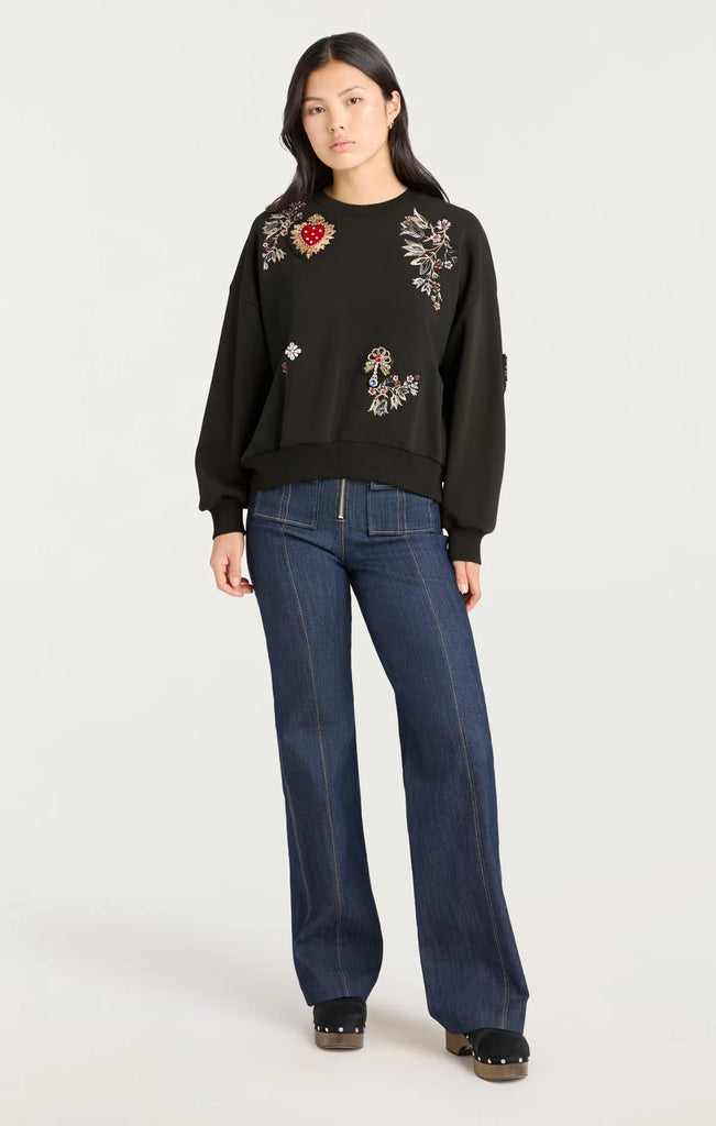 The Heritage Patch Brandy Pullover is a sophisticated black sweater featuring vibrant, colorful rhinestone embellishments that add sparkle and artistry. Its ribbed hem and cuffs provide a tailored fit, combining elegance with comfort for a polished, stylish look.
