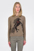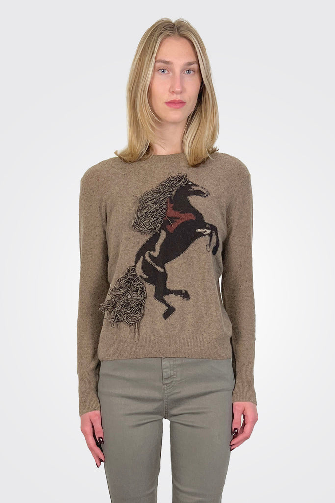 The Intarsia Horse knit with fringe sweater by Autumn Cashmere showcases a playful wild horse intarsia with a fun fringe detailing. Pair it with tailored trousers for an office look or denim for a more casual look. Its a fun statement piece.