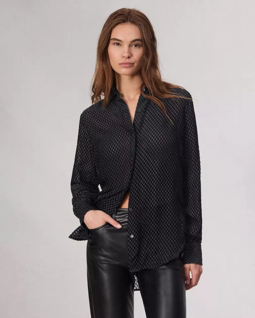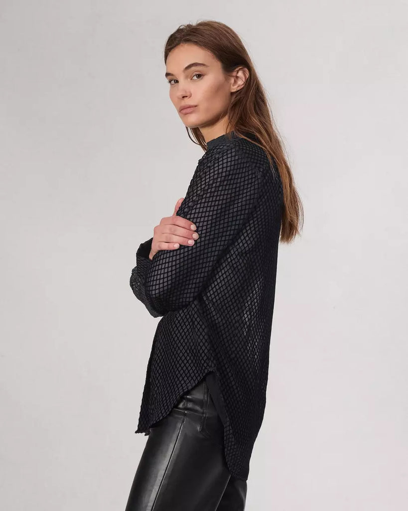 The Lila. This classic fitting shirt is buttoned up the front in our silk-viscose.