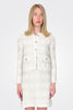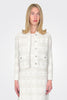 Straight-line chanel jacket with mandarin collar. Textured fabric, in cotton and faux suede yarns, jewel buttons.