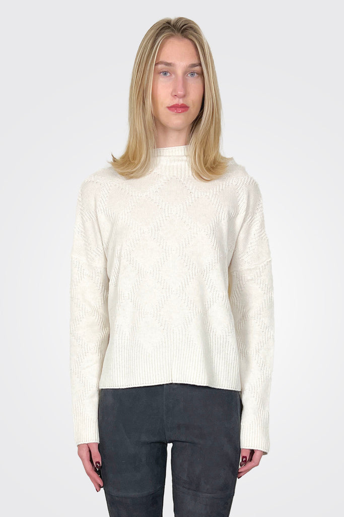 RECYCLED CASHMERE HIGH-NECK SWEATER WITH TONE-ON-TONE DIAMOND PATTERN. DROP SHOULDERS, HIGH ELASTICATED NECK, CUFFS AND HEM. HI-WAISTED, LOOSE FIT.