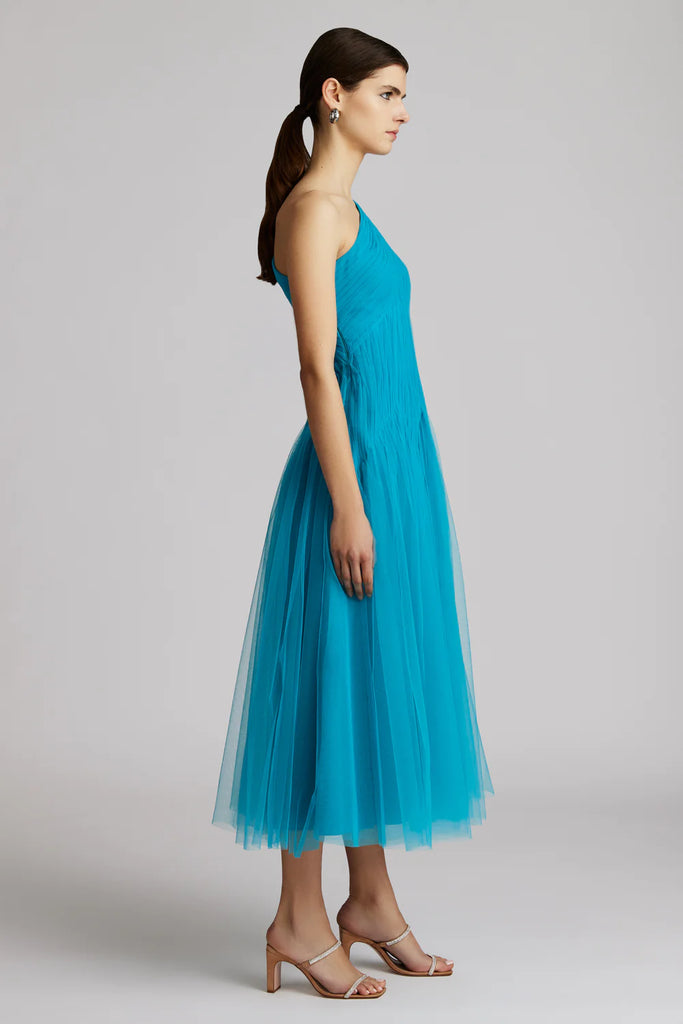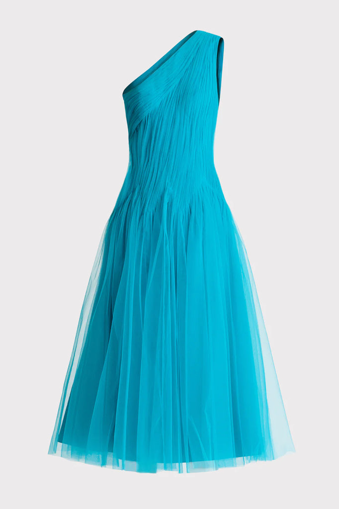 With an asymmetric pleating and stitch detailing along the bodice, this cocktail dress is party-ready. Crafted in a vibrant tulle, the flattering one-shoulder styling is offset with a voluminous layered midi-length skirt.