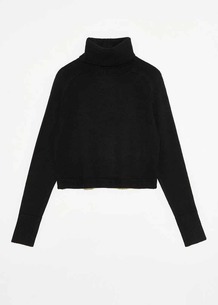 Viscose blend turtleneck sweater with long raglan sleeves. Crop length
