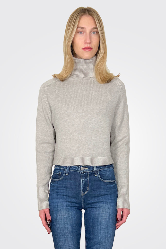 Viscose blend turtleneck sweater with long raglan sleeves. Crop length