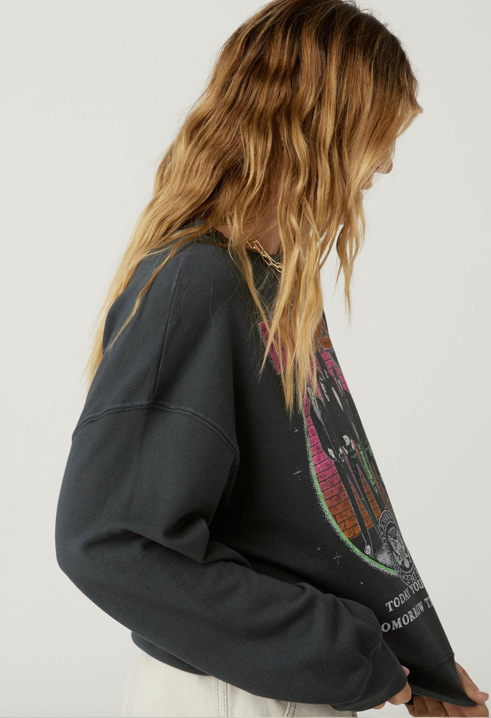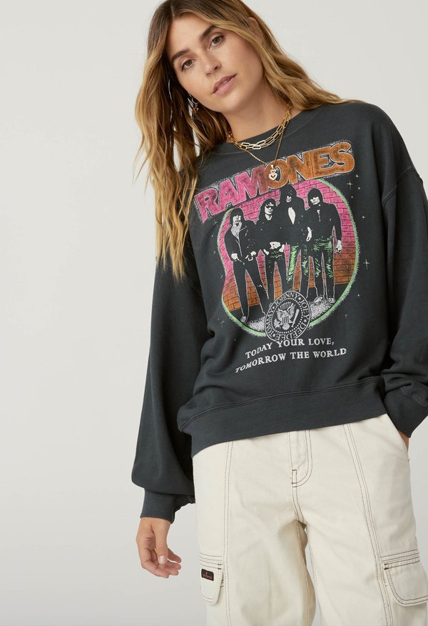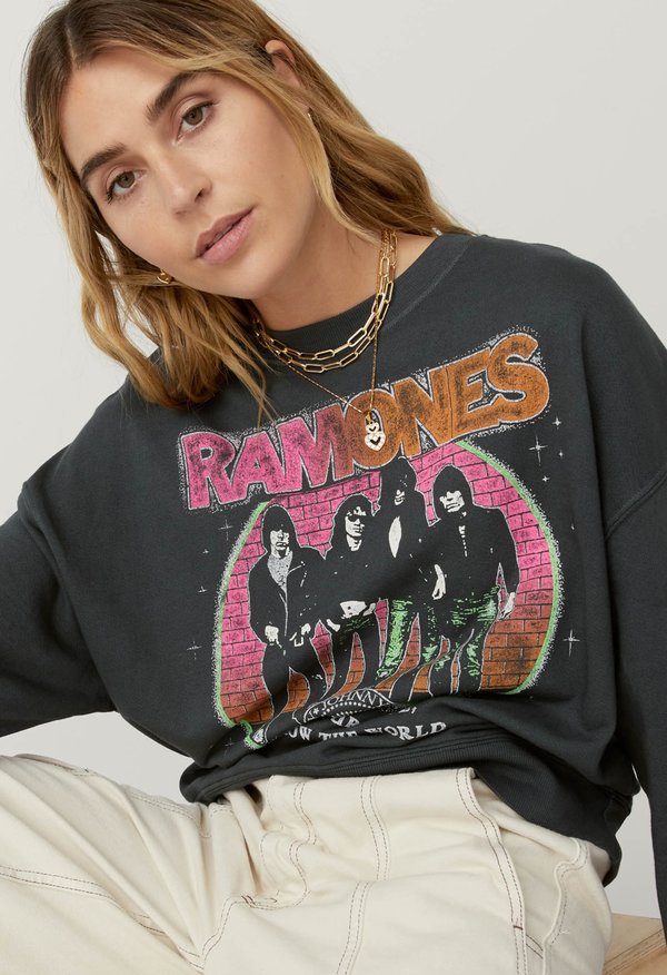 Today your love, tomorrow the world. Recall the early days of Punk Pioneers by celebrating a founding document for punk rock - the Ramones self titled debut album. Featuring the legendary band members in their regular uniform of ripped jeans and leather jackets, this oversized crew feels like a classic, yet easy, way to pay homage to the punk era. Some added details include dashes of glitter and a splash of colour, which will make any punk rock fan say - Hey! Ho! Let's go!