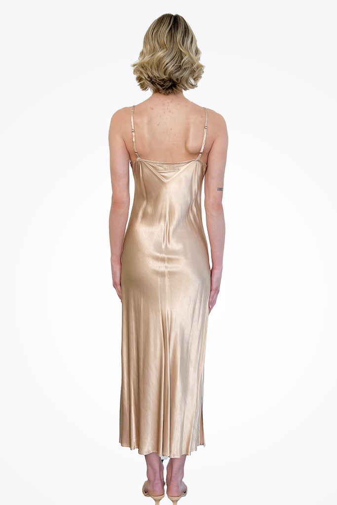 full-length slip dress is crafted from luxurious satin material and designed with a flattering bias cut, offering a fit that drapes comfortably for versatile day-to-night wear.