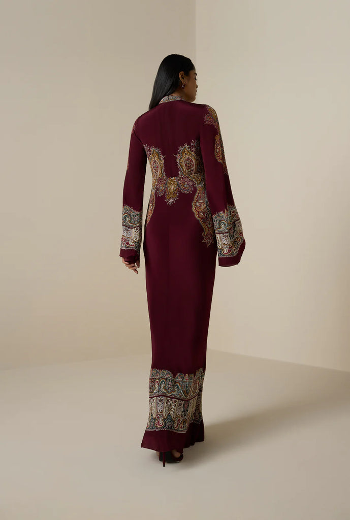 The Shifa Dress is an ode to timeless elegance with a twist. Crafted in luxurious viscose crepe, this long maxi features mock neck with a centre cutout, lending a modern, statement edge to its classic charm. Designed in a deep burgundy Jamawar print, the dress is fitted at the waist and flows graceful flare, enhanced by fit and fared sleeves that add fluid movement. Fully lined soft viscose for comfort, it secures at the back with a concealed zipper for a seamless finish