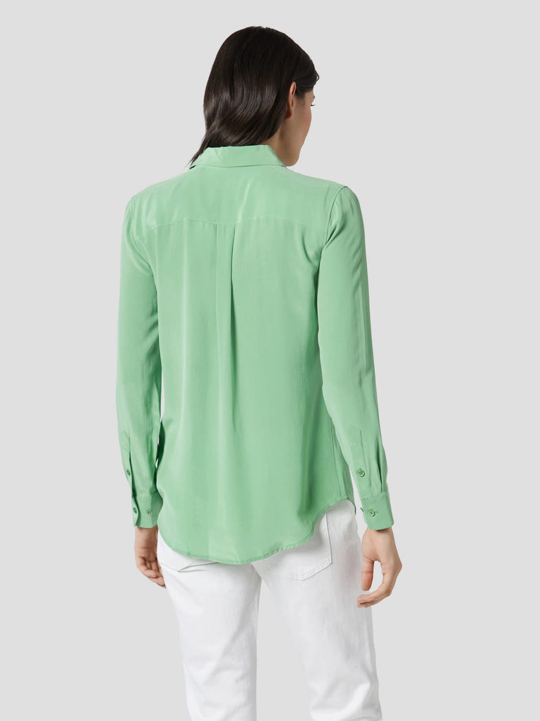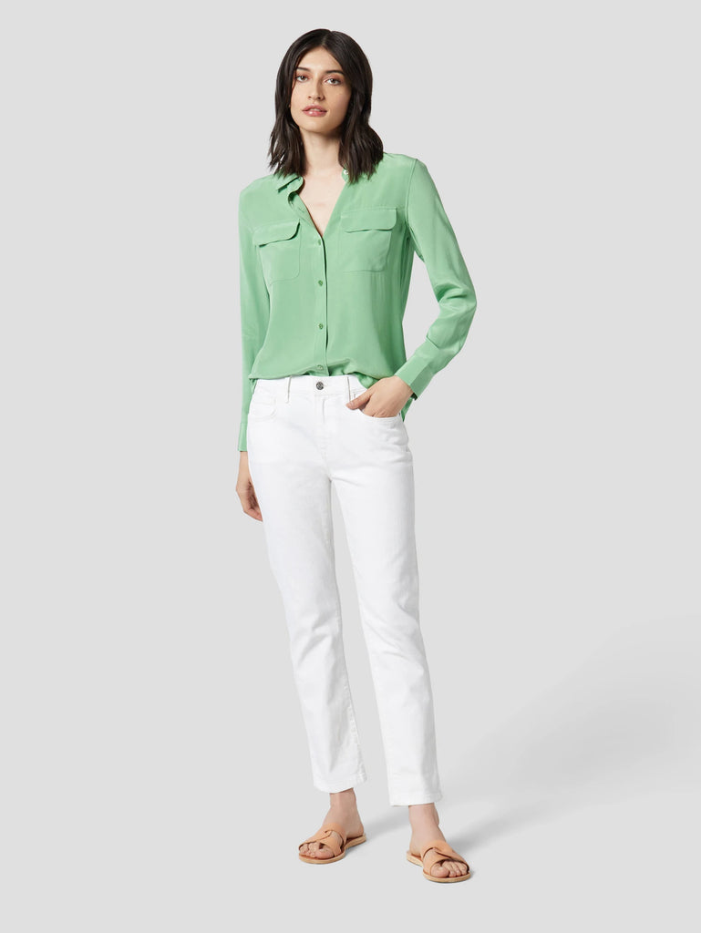 Equipment’s iconic Signature Shirt in soft sandwashed silk and a slimmer cut with two front pockets.