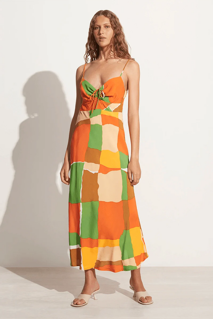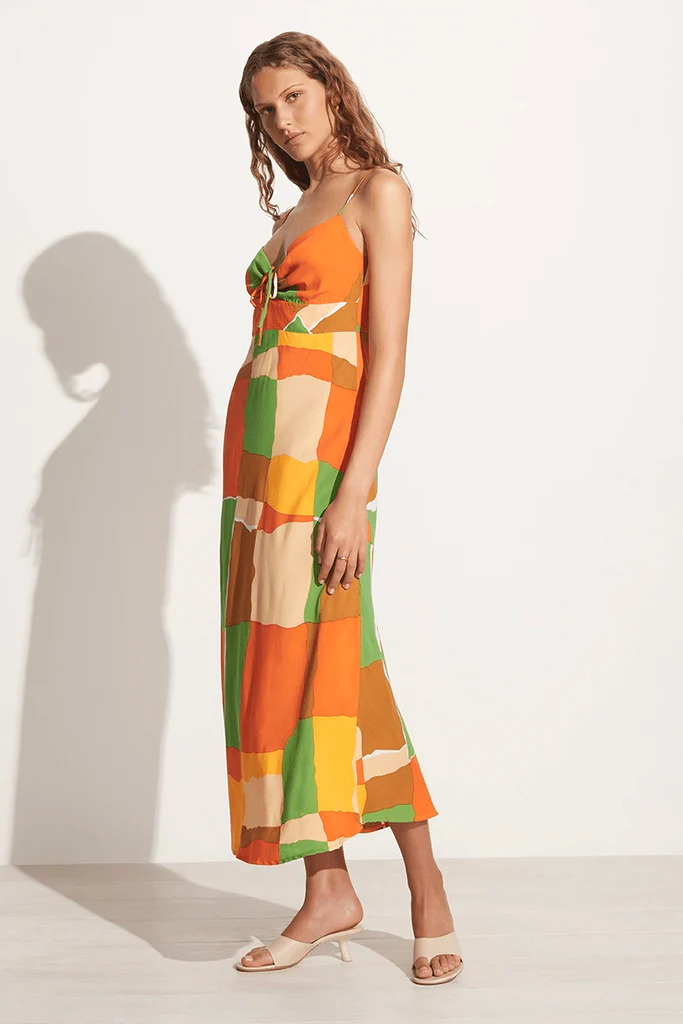Discover easy summer dressing and statement abstract prints in the Tempio Midi Dress. Made from our lightweight and responsibly sourced rayon crepe, this bias cut midi offers an easy-to-wear relaxed silhouette, thin shoulder straps and a gathered bust finished with a drawstring detail. Patterned with a retro-inspired check print using artisanal hand-printing techniques featuring a colourburst of statement summer hues.