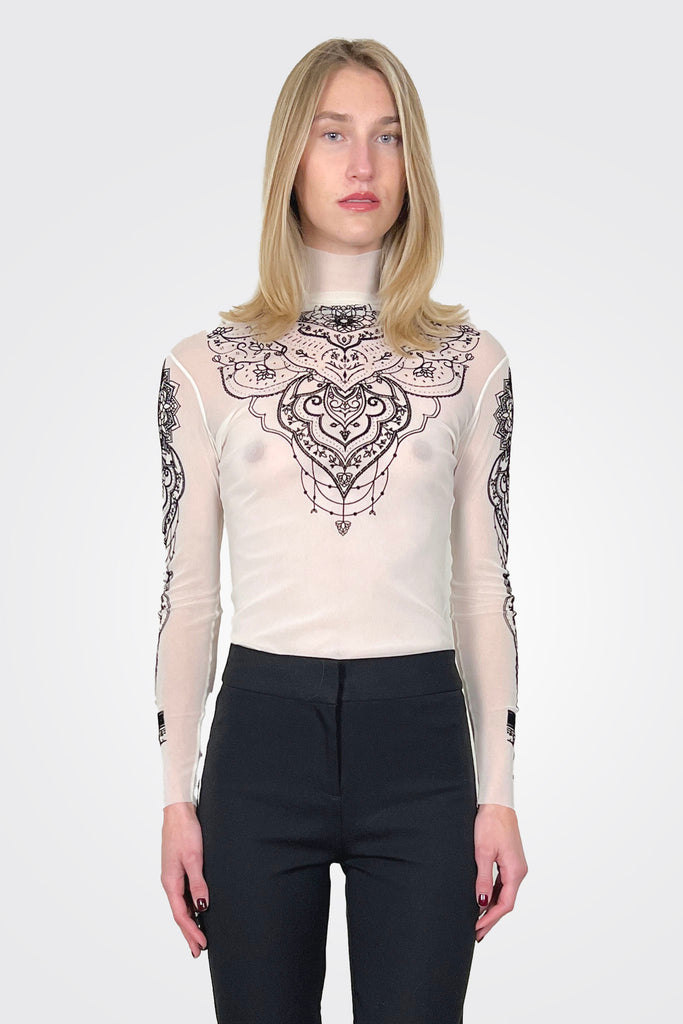 Stretch tulle single layer top that features an embossed suede henna tattoo print on front and back