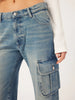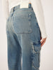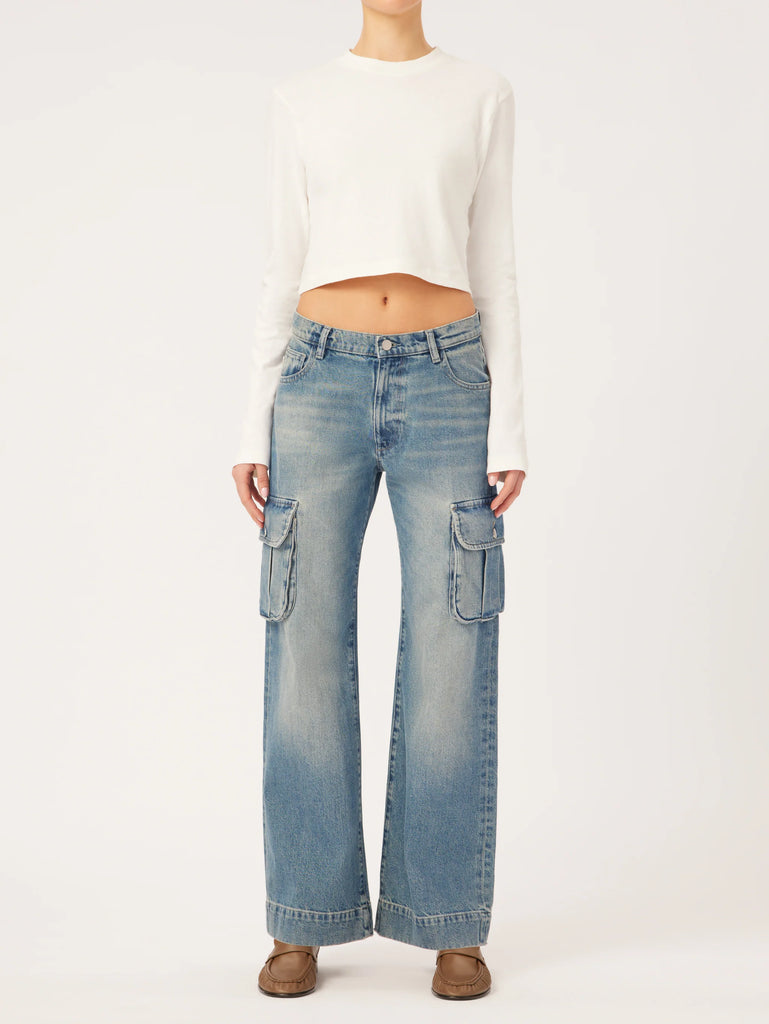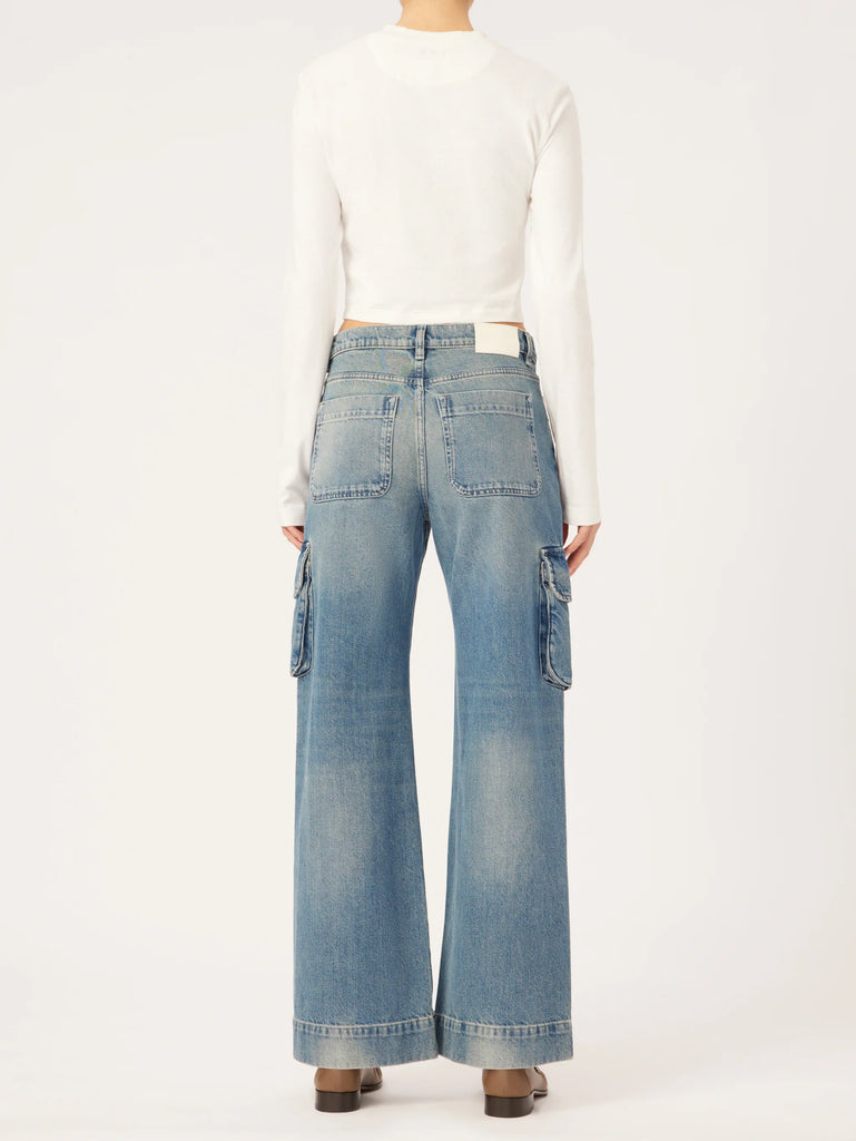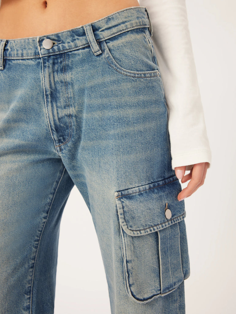 Aged Mid Cargo is a vintage inspired mid-indigo wash with an authentic worn-in look and cargo pockets at the thigh. It features brushed silver hardware, multi-colored stitching, wide clean hem and an ecru back patch.